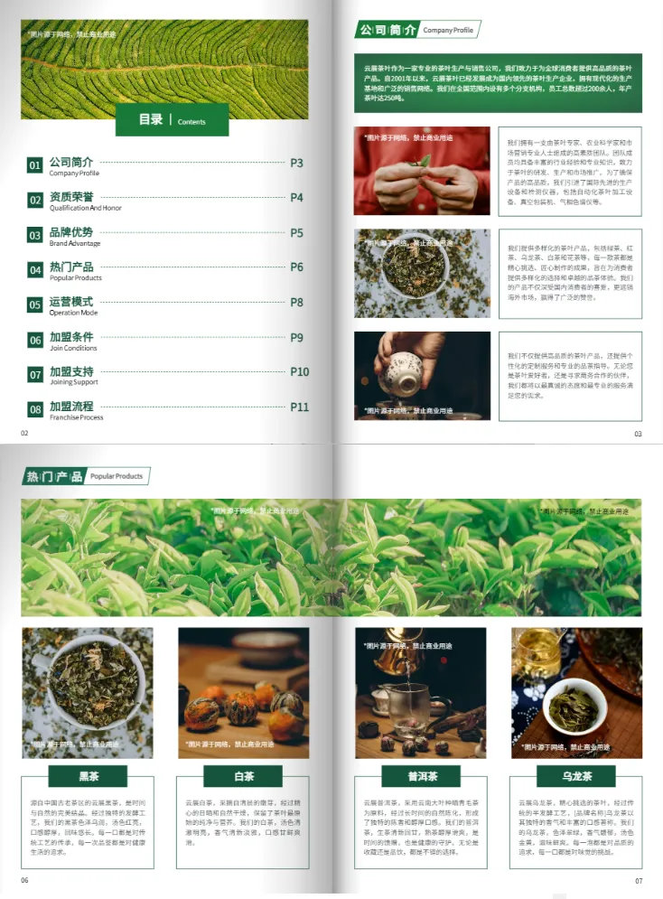 - 使用場景:適合茶葉品牌連鎖招商,做成電子版放在公眾號、官網上讓人招商加盟手冊下載,也可以打印精裝本送給重點客戶。