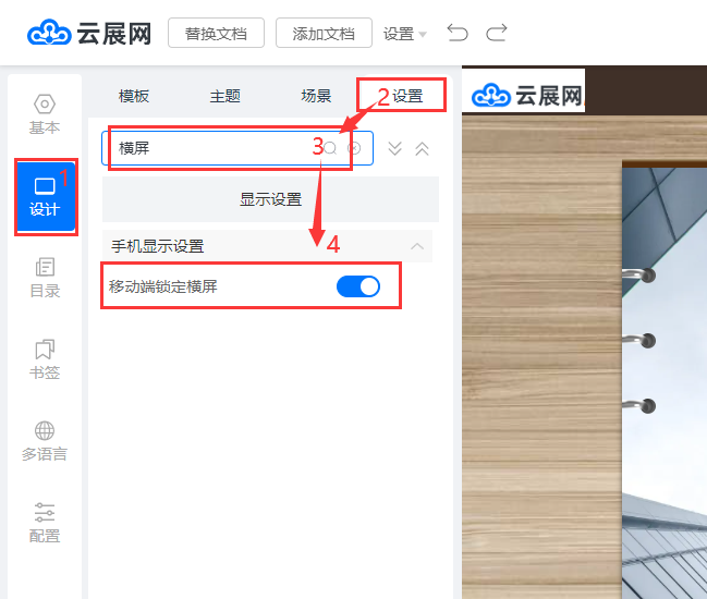 橫版的電子書如何設置移動端鎖定橫屏查看? 一、功能介紹 當上傳橫版的電子書時,手機端豎屏查看效果不佳。您可以設置移動端鎖定橫屏功能,無需手動調整,手機打開電子書時屏幕將自動切換為橫屏模式查看。 二、操作步驟 1、打開編輯頁面 在【我的文檔】頁面,找到需要編輯的電子書,點擊【編輯】進入 2、設置移動端鎖定橫屏功能 在【設計】頁面,點擊【設置】,搜索“橫屏關鍵字”,勾選【移動端鎖定橫屏】 3、保存查看效果 點擊右上角的【保存/預覽】