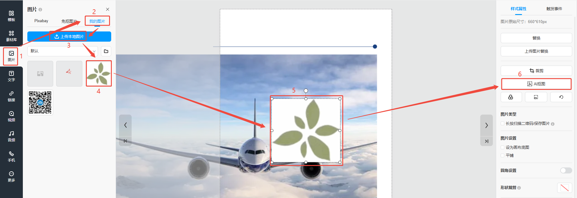 點擊【圖片】,再點擊【我的圖片】,然后點擊【上傳本地圖片】,將圖片上傳到下方素材庫中,點擊素材庫中的圖片,圖片會出現在頁面上,選中頁面上的圖片,最后點擊右側【AI摳圖】,打開AI摳圖界面。