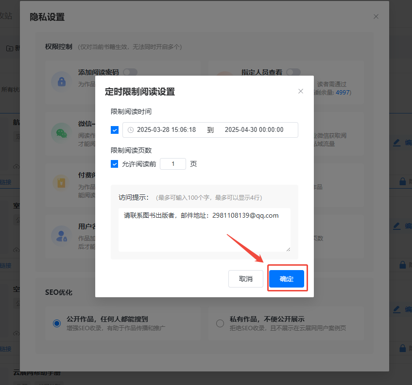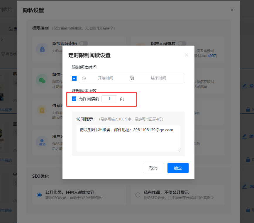 如果想要非限定的時間段內(nèi)讀者可以試看,可以設(shè)置允許閱讀前幾頁。