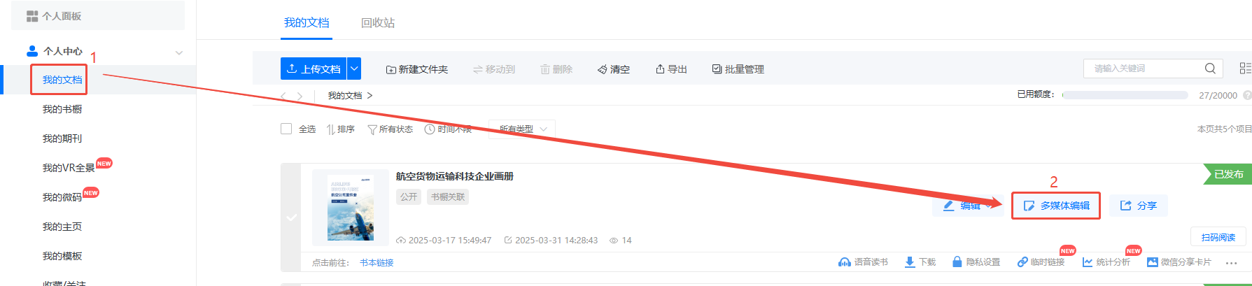 如何將多個元素組合成一個整體? 一、功能介紹 此功能可以將多個元素合并成一個整體,方便一起移動、調整或管理。 二、操作步驟 1、打開編輯器界面 點進【我的文檔】/【文檔】,選擇對應電子書,點擊【多媒體編輯】/【內容編輯】。 2、創建組合 按住鍵盤的ctrl鍵,鼠標左鍵選擇多個元素,點擊右上角【創建組合】,或者右鍵選擇【組合】,即可把多個元素合并成一個整體,方便一起移動、調整或者管理。