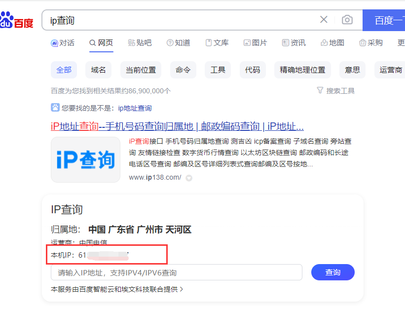 在電腦或者手機的瀏覽器上搜索【IP查詢】就可以獲取當前的網絡IP地址。