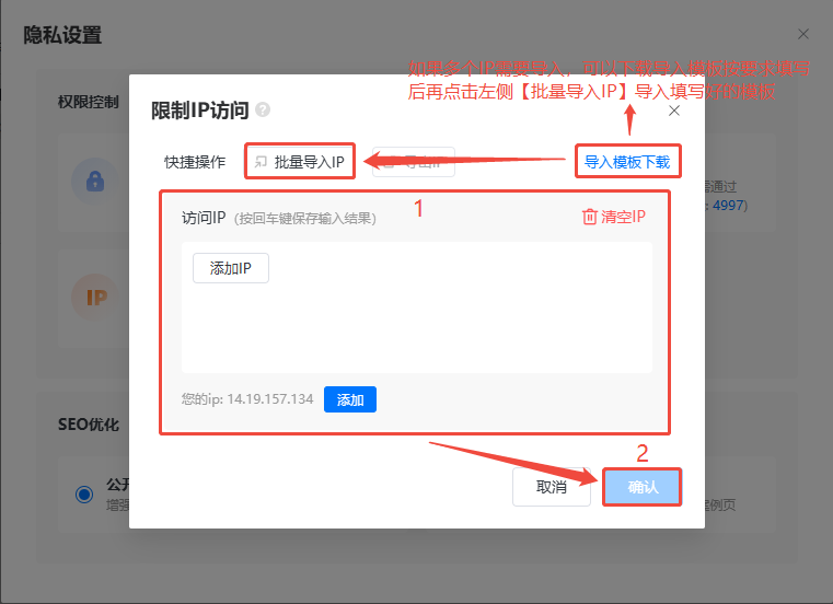 1、如果有多個IP地址需要導入,可以點擊右上角【導入模板下載】,下載導入模板按要求填寫后再點擊左側【批量導入IP】導入填寫好的模板,再點擊【確認】即可。