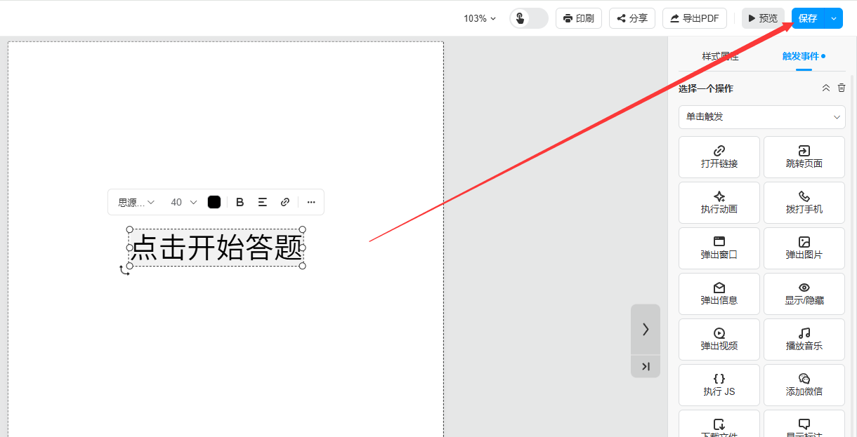 點擊【鏈接】,將出現在頁面上超鏈接放置到文字或者圖片上,點擊右上角【觸發事件】,選擇【答題測驗】,點擊【編輯問題】。