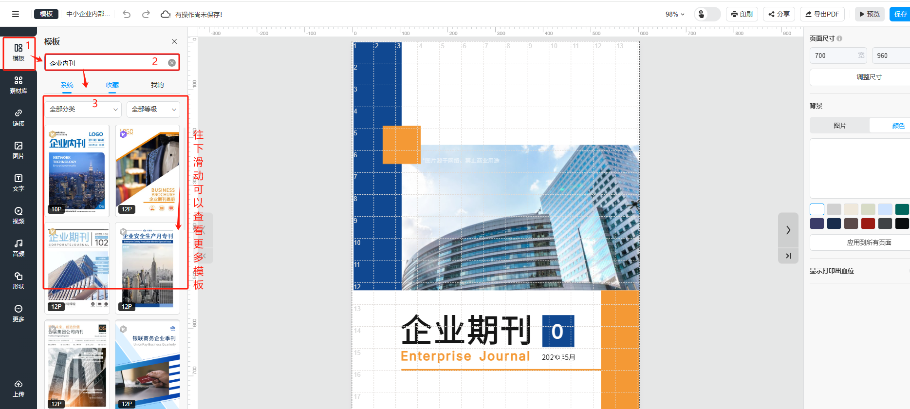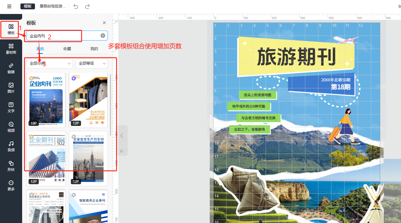 (1)在編輯器頁面,點擊左邊的【模板】,輸入關鍵字搜索后,往下滑動可以瀏覽更多模板