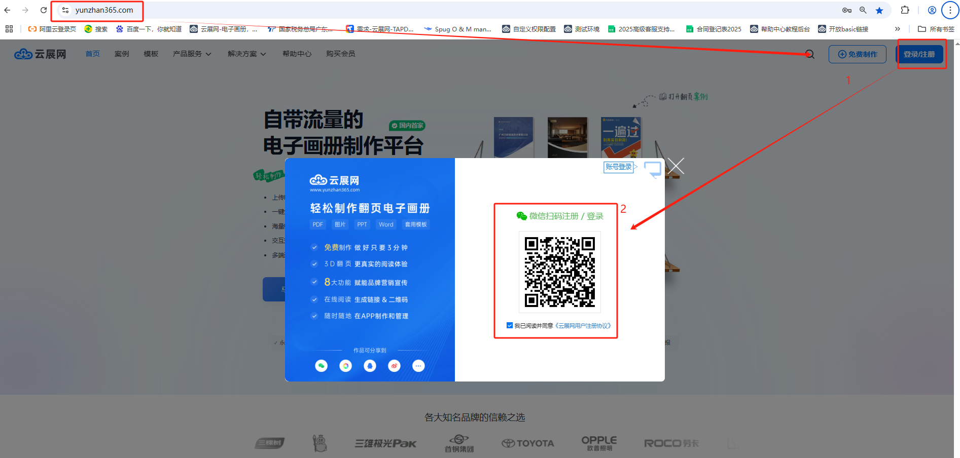 在電腦上打開瀏覽器,輸入網址http://www.ccdkh.com/打開云展網,然后點擊右上角的【登錄/注冊】按鈕,用微信掃描二維碼登錄