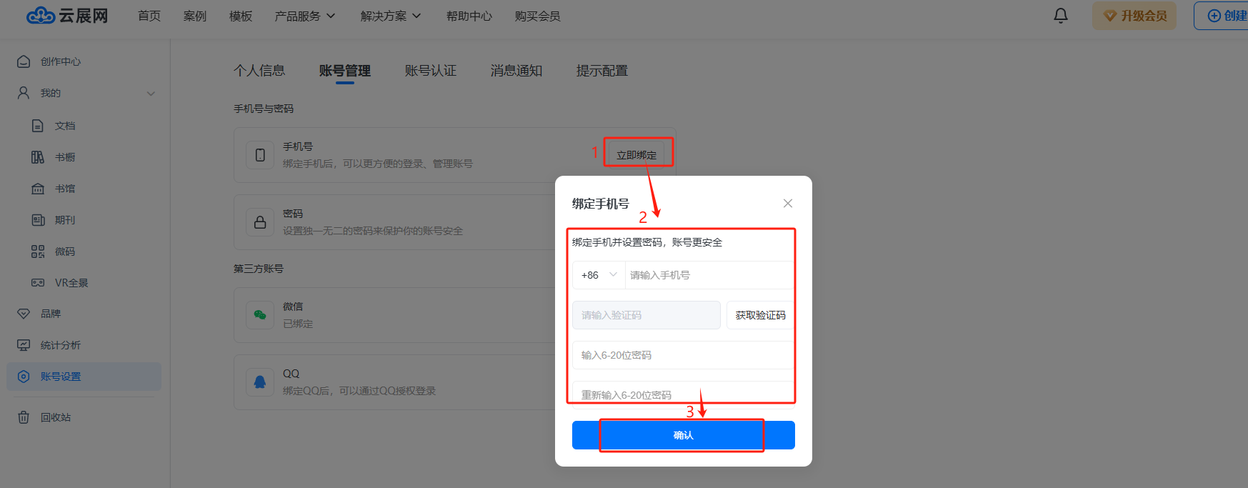點擊【立即綁定】按鈕,輸入手機號、驗證碼、密碼,然后點擊【確認】,即可完成手機號綁定