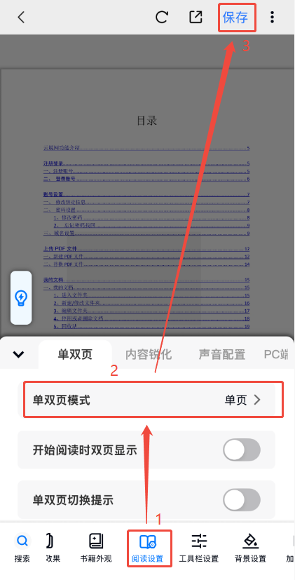 APP上如何設(shè)置單頁顯示? 一、功能介紹 當(dāng)觀看電子書所使用的設(shè)備的較小時,比如手機(jī),建議使用單頁顯示,觀感最佳。 二、操作步驟 1、打開編輯界面 點(diǎn)擊【作品】,然后點(diǎn)擊對應(yīng)電子書的【編輯】,打開編輯界面。 2、設(shè)置單頁顯示 點(diǎn)擊下方【閱讀設(shè)置】,將【單雙頁模式】改為單頁,最后點(diǎn)擊右上角保存即可。