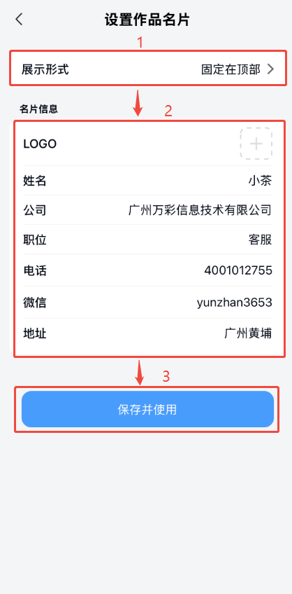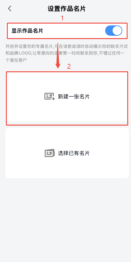 打開(kāi)【顯示作品名片】,點(diǎn)擊下方【新建一張名片】創(chuàng)建名片,選擇需要的展示形式,完善名片信息后,點(diǎn)擊【保存并使用即可】。