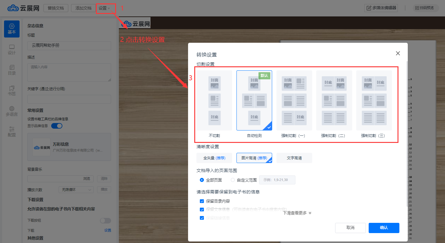 在【我的文檔】頁面,點擊【上傳文檔】打開上傳頁面,點擊【轉換設置】,選擇切割方式