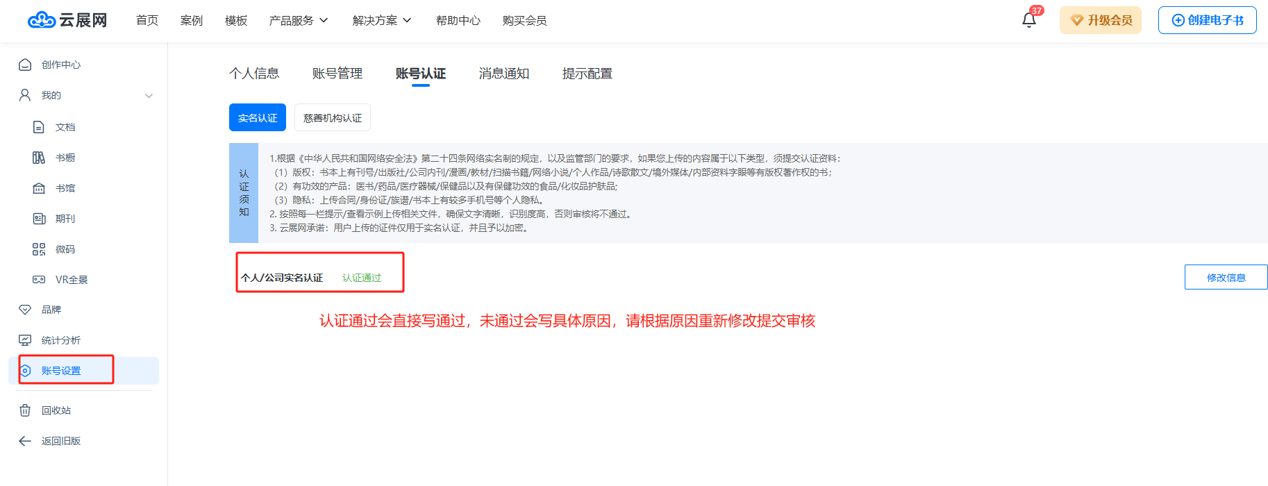 電腦登錄云展網(wǎng)網(wǎng)站,登錄您的賬號(hào),點(diǎn)擊【賬號(hào)設(shè)置】,點(diǎn)擊【賬號(hào)認(rèn)證】打開(kāi)賬號(hào)認(rèn)證界面