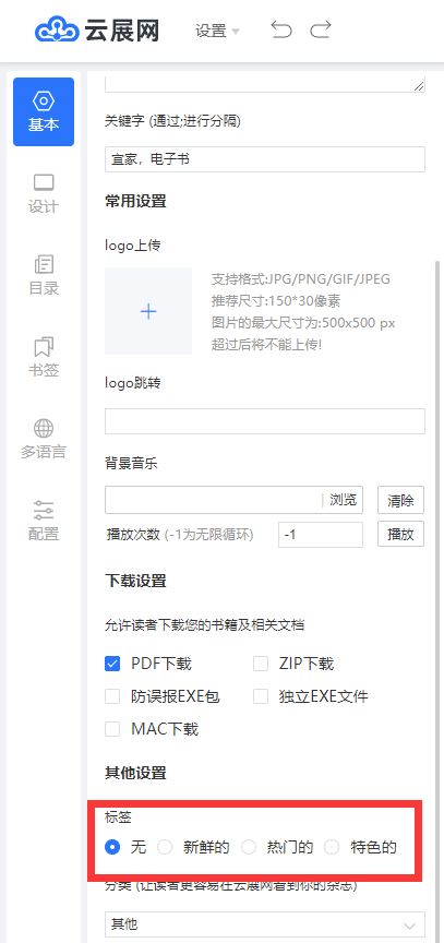 在編輯電子雜志的雜志信息下可以設置標簽: