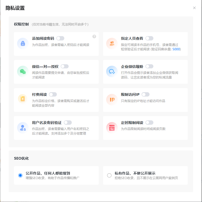 電子雜志隱私設(shè)置有10種:添加閱讀密碼、指定人員查看、企業(yè)微信吸粉、微信一對(duì)一授權(quán)閱讀、付費(fèi)閱讀、限制訪問(wèn)IP、用戶名及密碼驗(yàn)證、定時(shí)限制閱讀、在云展網(wǎng)上私有、網(wǎng)站上公開(kāi)。