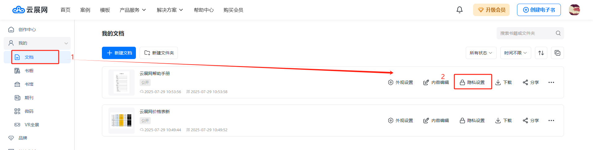 在【我的文檔】里找到要設(shè)置的電子雜志,點(diǎn)擊【隱私設(shè)置】。