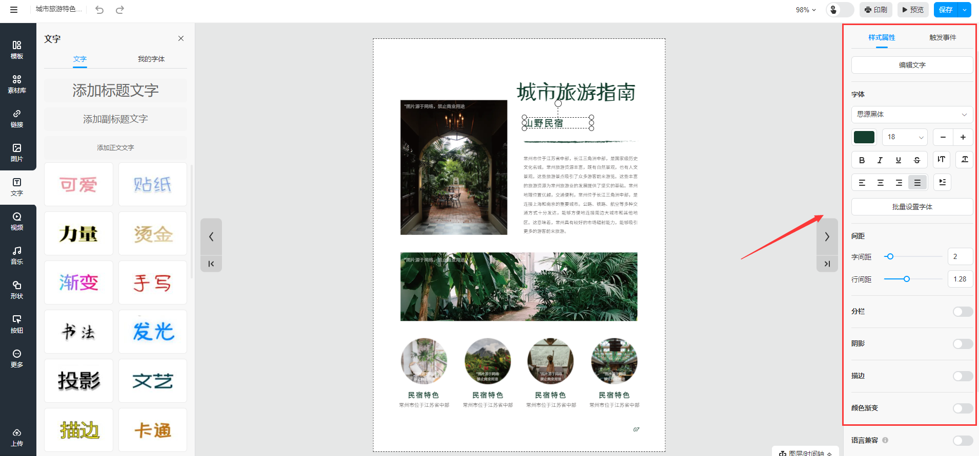 添加文字功能可以在空白文檔中快速添加文本區域、標題、副標題及使用酷炫文體。也可以在生成電子書后,追加文字而不用重新上傳文檔。添加文字可以提供內容解釋和詳細信息,引導讀者更深入理解。