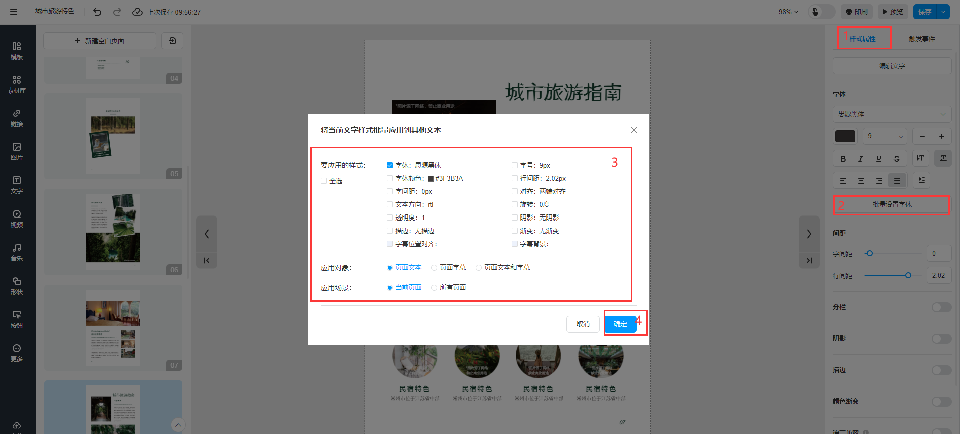 選中文本內容進入【樣式屬性】,點擊【批量設置字體】,勾選要應用的樣式、對象以及場景,并點擊【確定】完成批量應用。