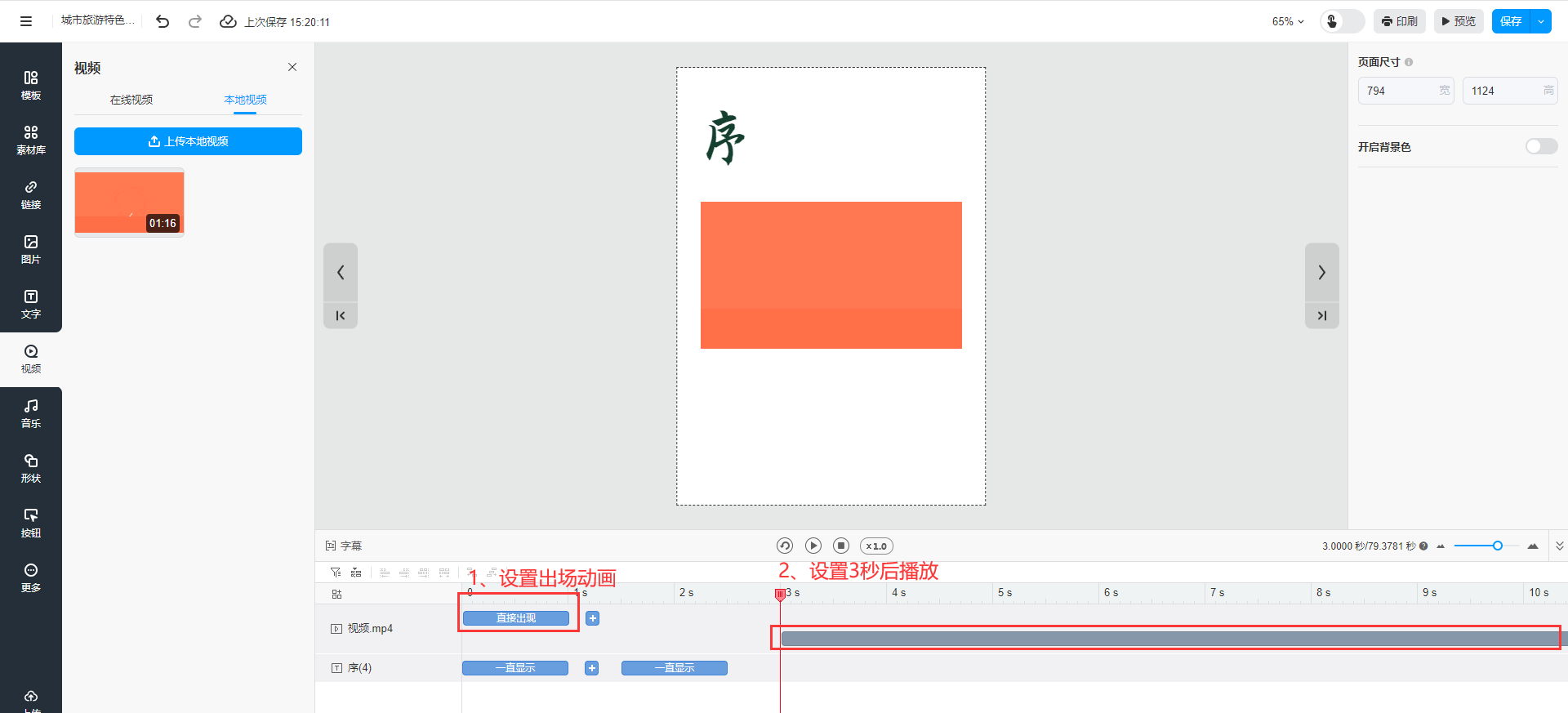 在時間軸設置視頻出現的時間,比如0-3S之間給視頻設置一個出場動畫,然后到第3秒的時候開始播放視頻