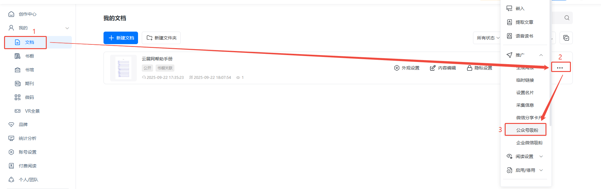 (1)選中【文檔】/【書櫥】,點擊右邊三個點,然后點擊公眾號吸粉。