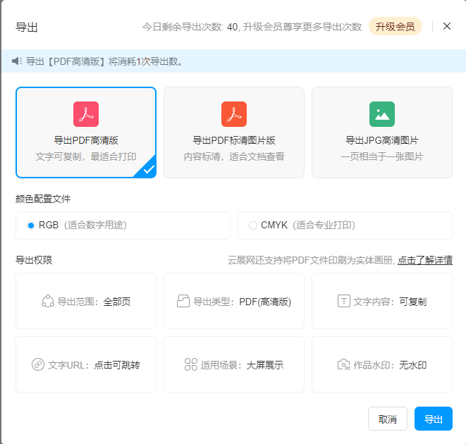 點擊【導出】,可以導出PDF或者圖片文件用于打印。