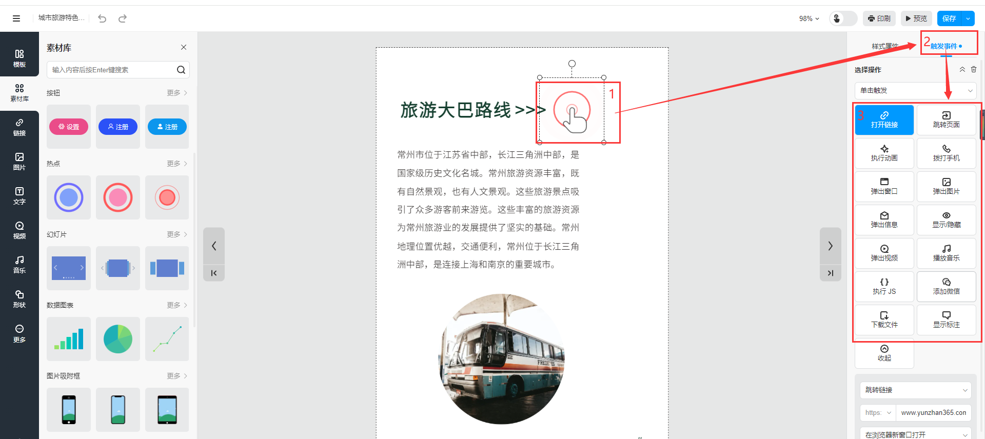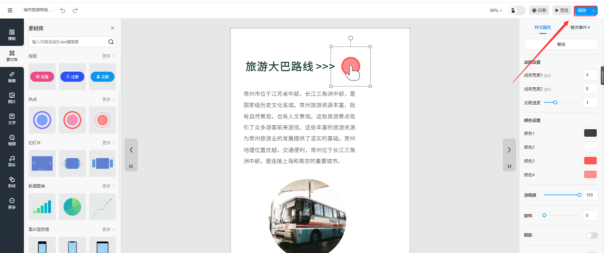 點擊【素材庫】,選擇【熱點】添加在頁面合適的位置上,右側點擊【樣式屬性】可更改熱點樣式