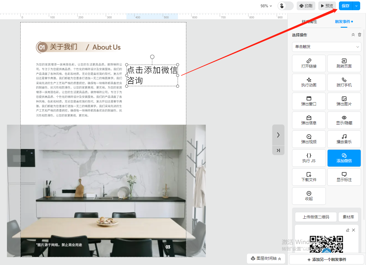 選中需要彈出微信二維碼的文字或者圖片,點(diǎn)擊右上角的【觸發(fā)事件】,選擇【添加微信】,然后點(diǎn)擊【上傳微信二維碼】上傳微信二維碼圖片。