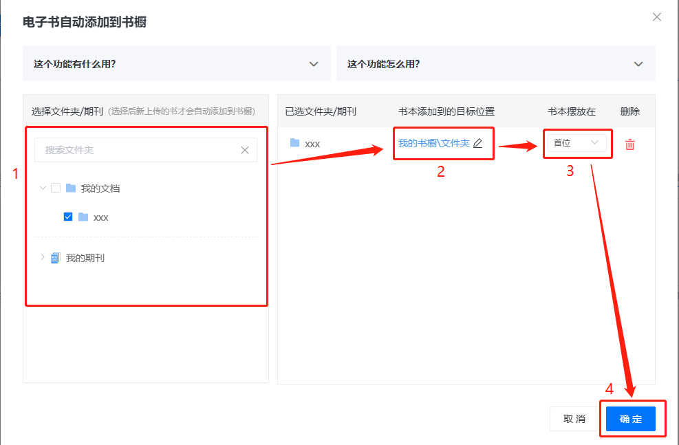 (2)左側(cè)選擇文件夾/期刊,右側(cè)選擇書本添加到的目標位置和擺放位置,后續(xù)在所選文件夾/期刊內(nèi)新上傳的書,將會自動添加到該書櫥內(nèi)。