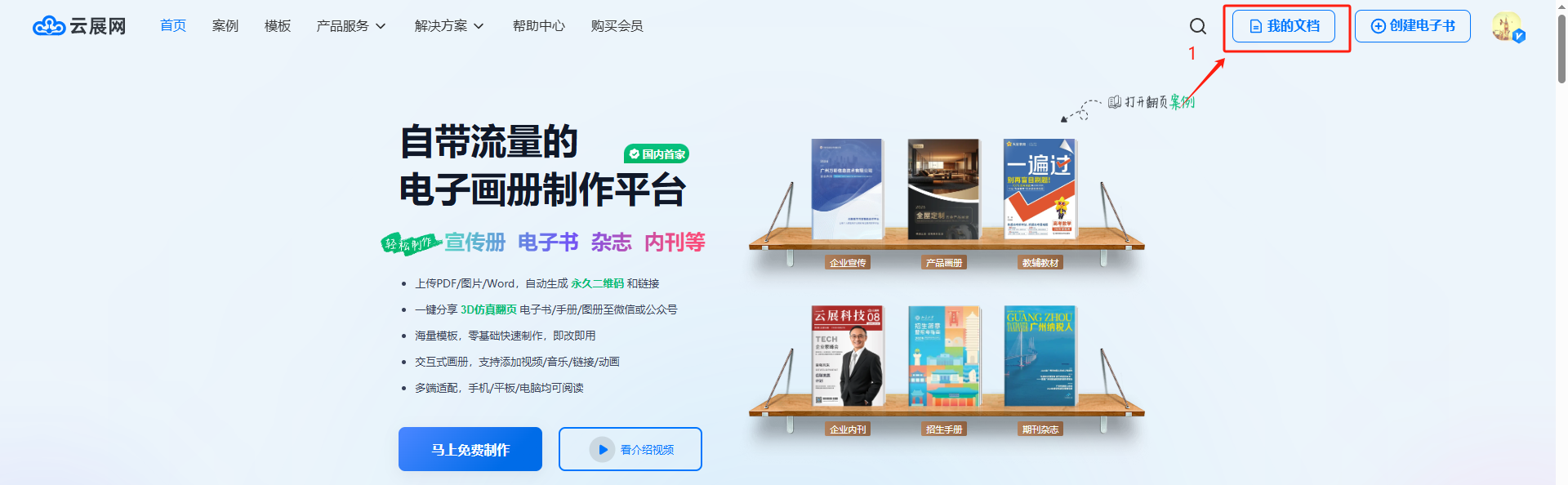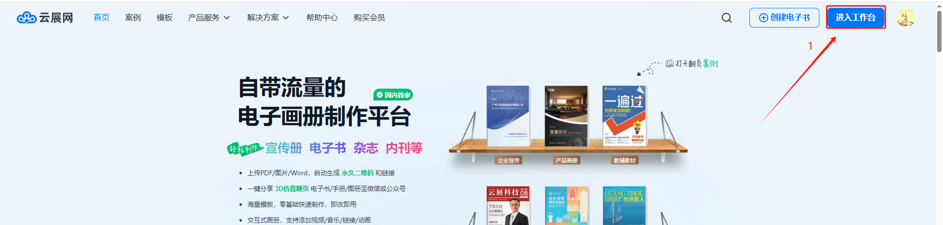 你可以從云展網(wǎng)首頁點(diǎn)擊【我的文檔】/【進(jìn)入工作臺】界面
