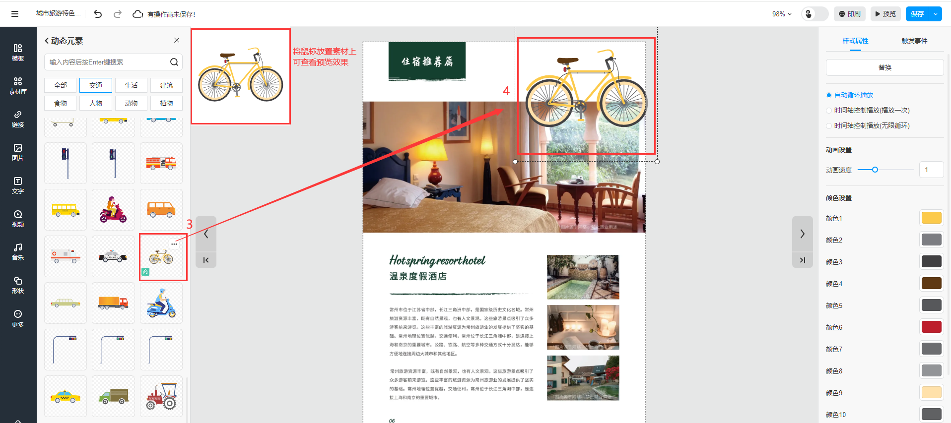 在添加動態元素/特效后,你可對其進行動畫設置,調整動畫的速度和播放設置。