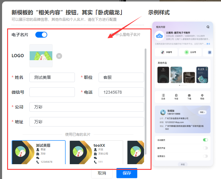 輸入【姓名】、【職位】、【微信號】、【電話】、【公司】、【地址】信息后,點擊【保存】