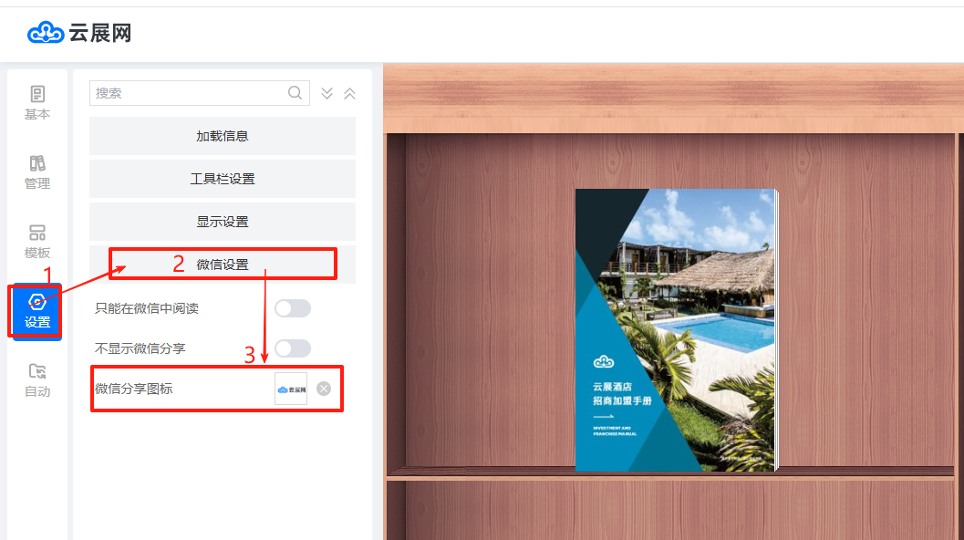 在【設(shè)置】頁面,點擊【微信設(shè)置】,上傳微信分享圖標(biāo)