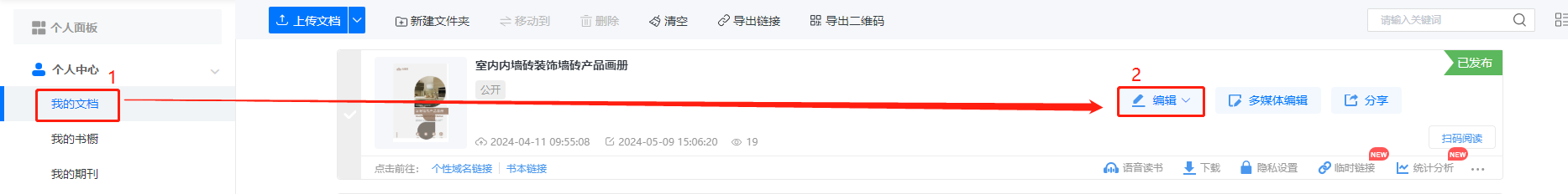點擊【我的文檔】,點擊設置好配置的畫冊的【編輯】,打開編輯界面。