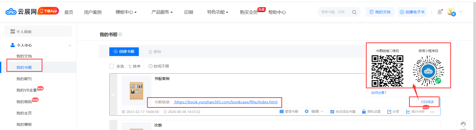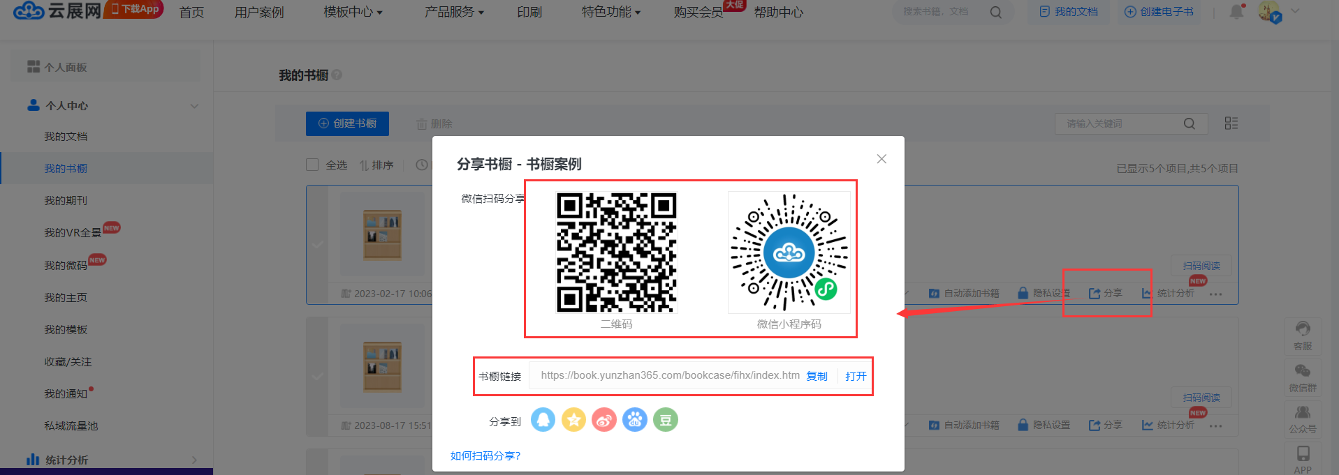 每個書櫥都有相應的鏈接、二維碼以及小程序碼,在【我的書櫥】頁面,創建書櫥后自動生成,如下圖操作,可以查看到書櫥鏈接、二維碼和小程序碼
