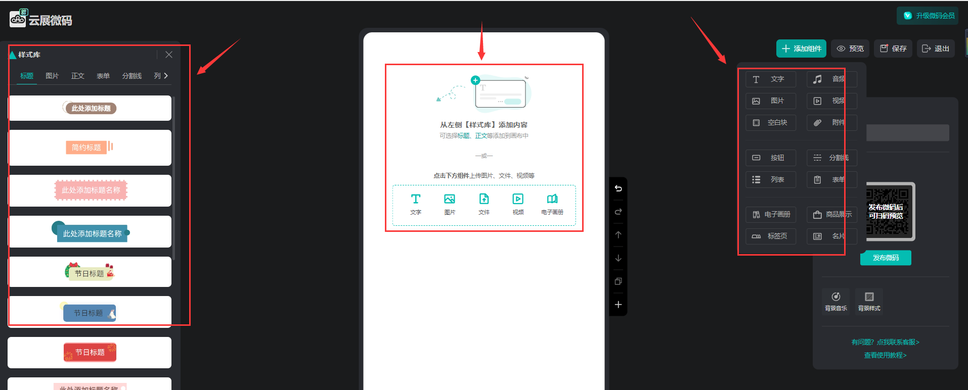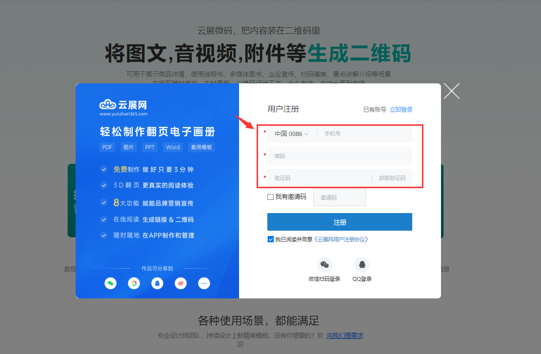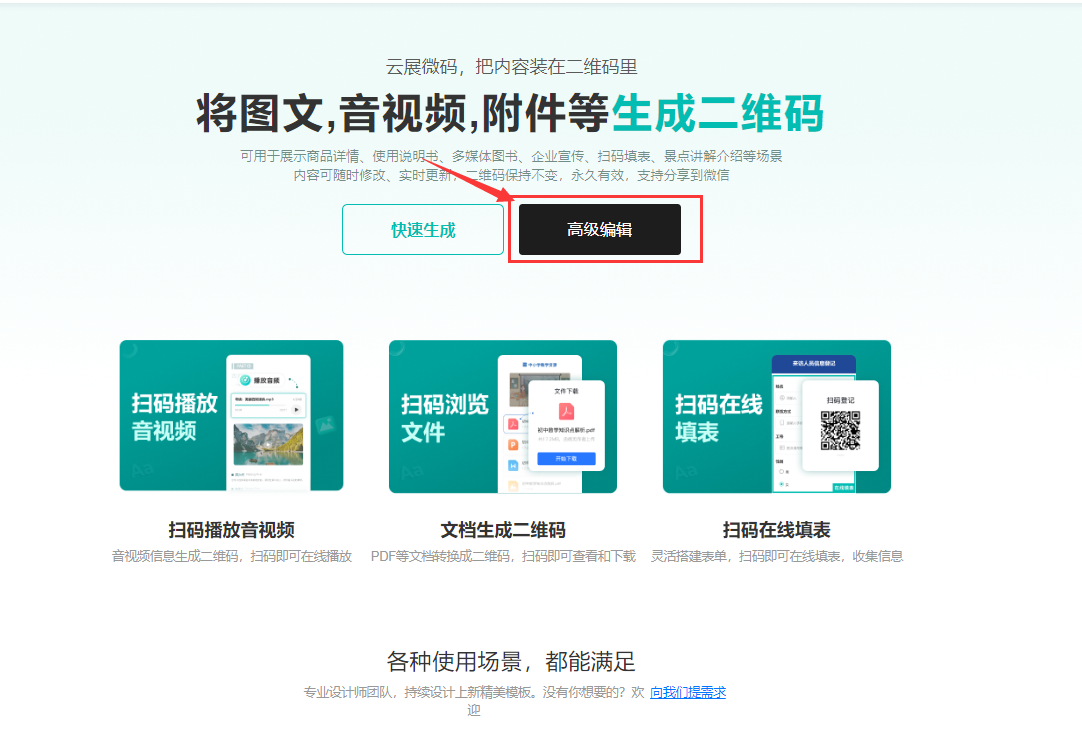 云展微碼是指將圖文、音視頻、附件等內容快速生成H5、海報圖片、長頁圖片、問卷表單、邀請函,并一鍵生成二維碼在線查看。可在產品介紹、企業(yè)宣傳、教輔圖書多媒體資料、電子書架、使用說明書等多領域靈活應用。