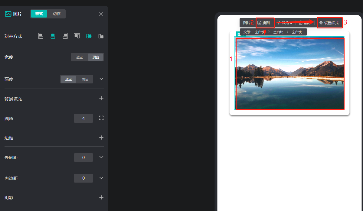 如果需要更換圖片,可以點擊微碼中的圖片,然后點擊【換圖】,然后點擊【設置樣式】,便可以在左邊設置圖片樣式。