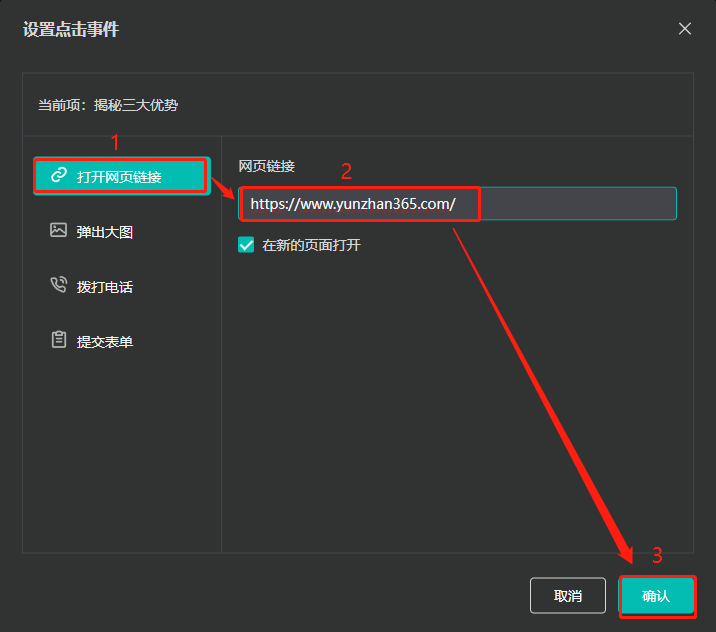 (2)選擇【打開(kāi)網(wǎng)頁(yè)鏈接】,右側(cè)輸入網(wǎng)頁(yè)鏈接,點(diǎn)擊【確認(rèn)】。