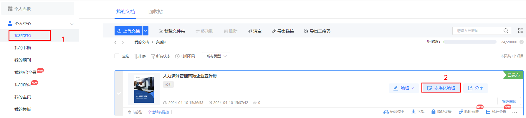點進【我的文檔】/【文檔】,選擇對應電子書,點擊【多媒體編輯】/【內容編輯】。