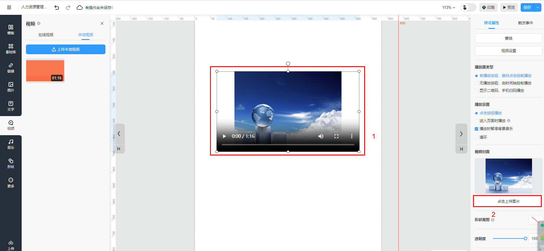 溫馨提示:【無播放按鈕,由時間軸控制播放】僅支持上傳本地視頻類型勾選。