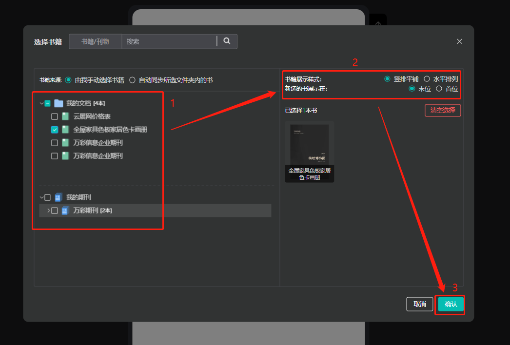 左邊勾選要添加的電子畫(huà)冊(cè),右上角選擇【展示樣式】和【展示位置】,最后點(diǎn)擊右下角【確認(rèn)】。
