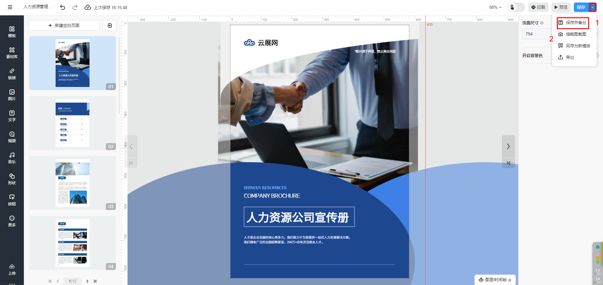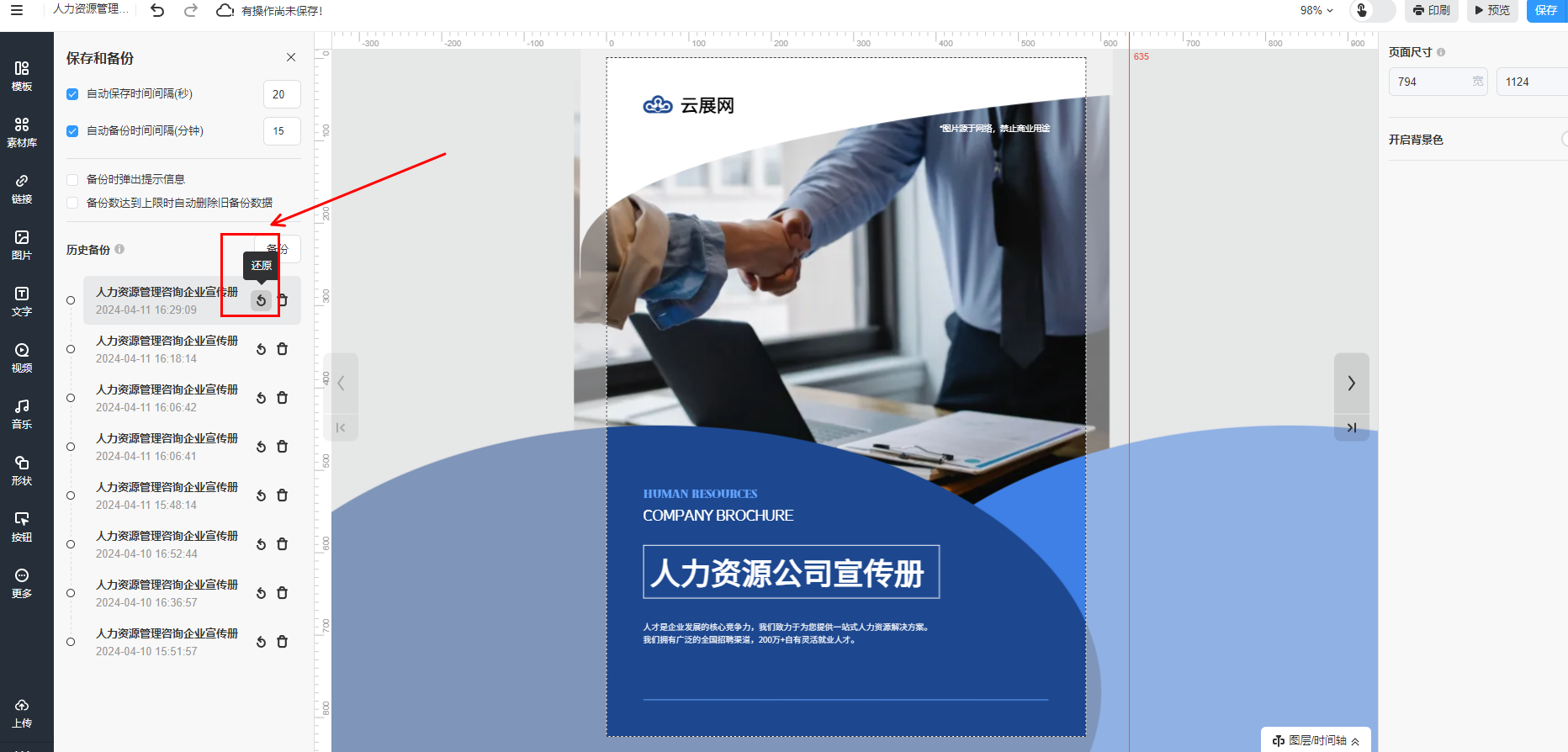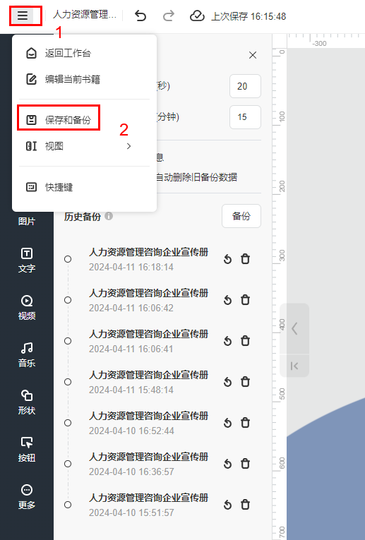 所有設置完成以后,在多媒體編輯器右上角點擊【保存并備份】。