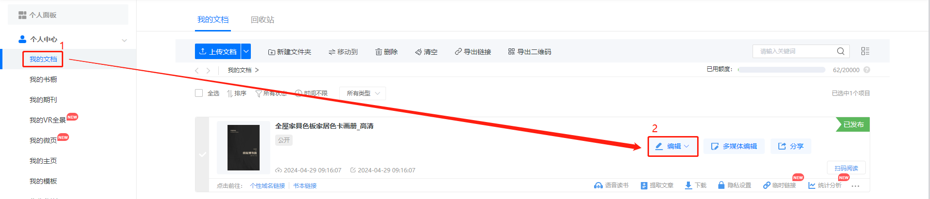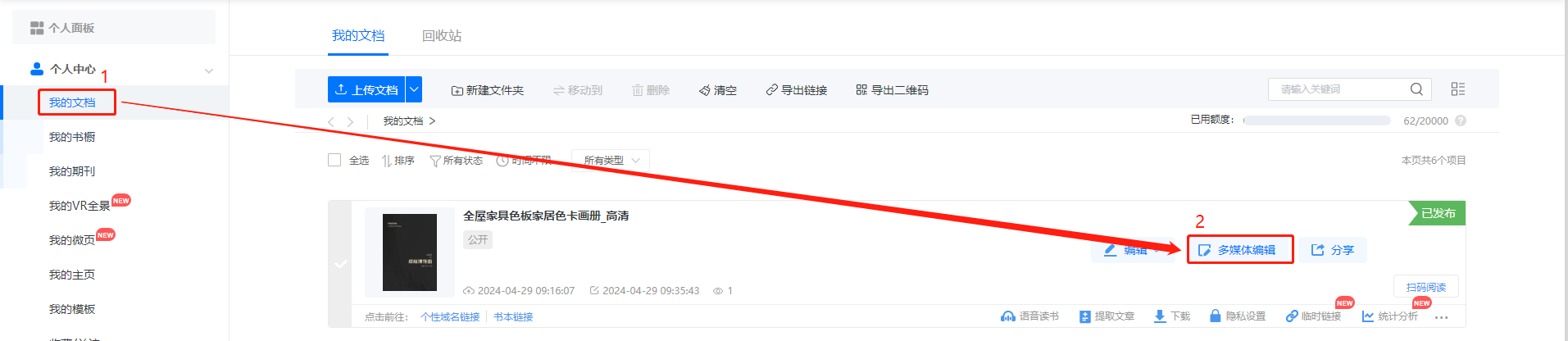 在【我的文檔】找到需要編輯的書并且點擊【多媒體編輯】按鈕。