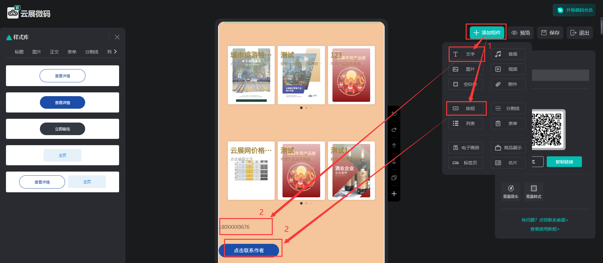 點擊【添加組件】,點擊【文字】或者【按鈕】,輸入聯系電話號碼/聯系作者