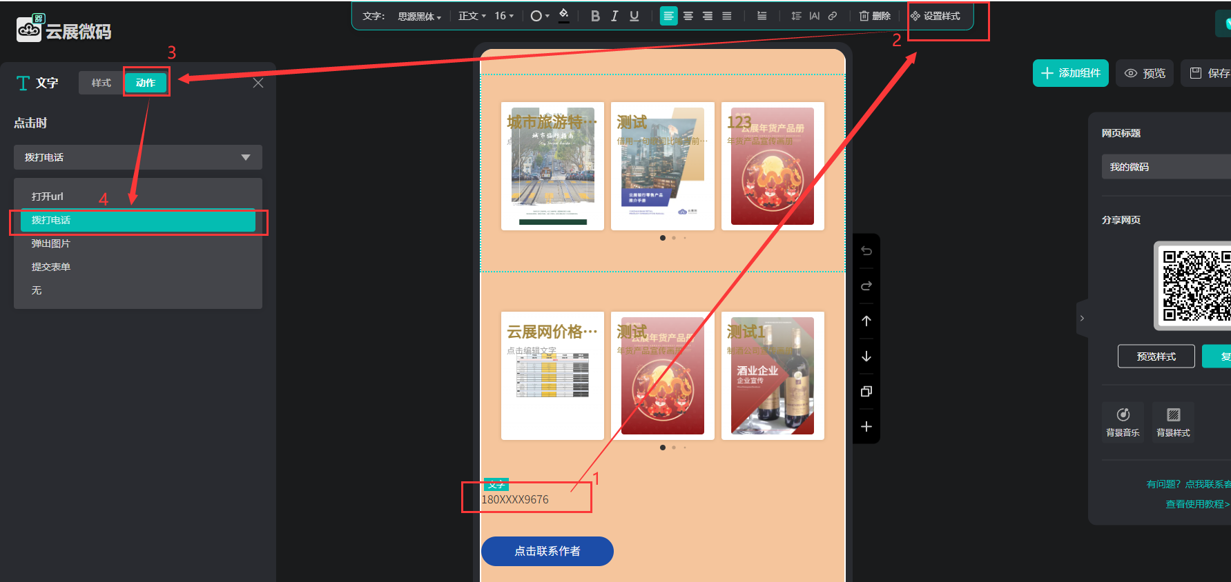 選中聯系電話號碼/按鈕,點擊【設置樣式】,點擊【動作】,設置【撥打電話】,輸入聯系電話號碼