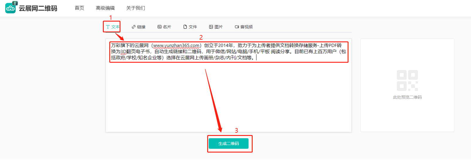 (1)點擊【文本】,下方輸入文案,點擊【生成二維碼】。