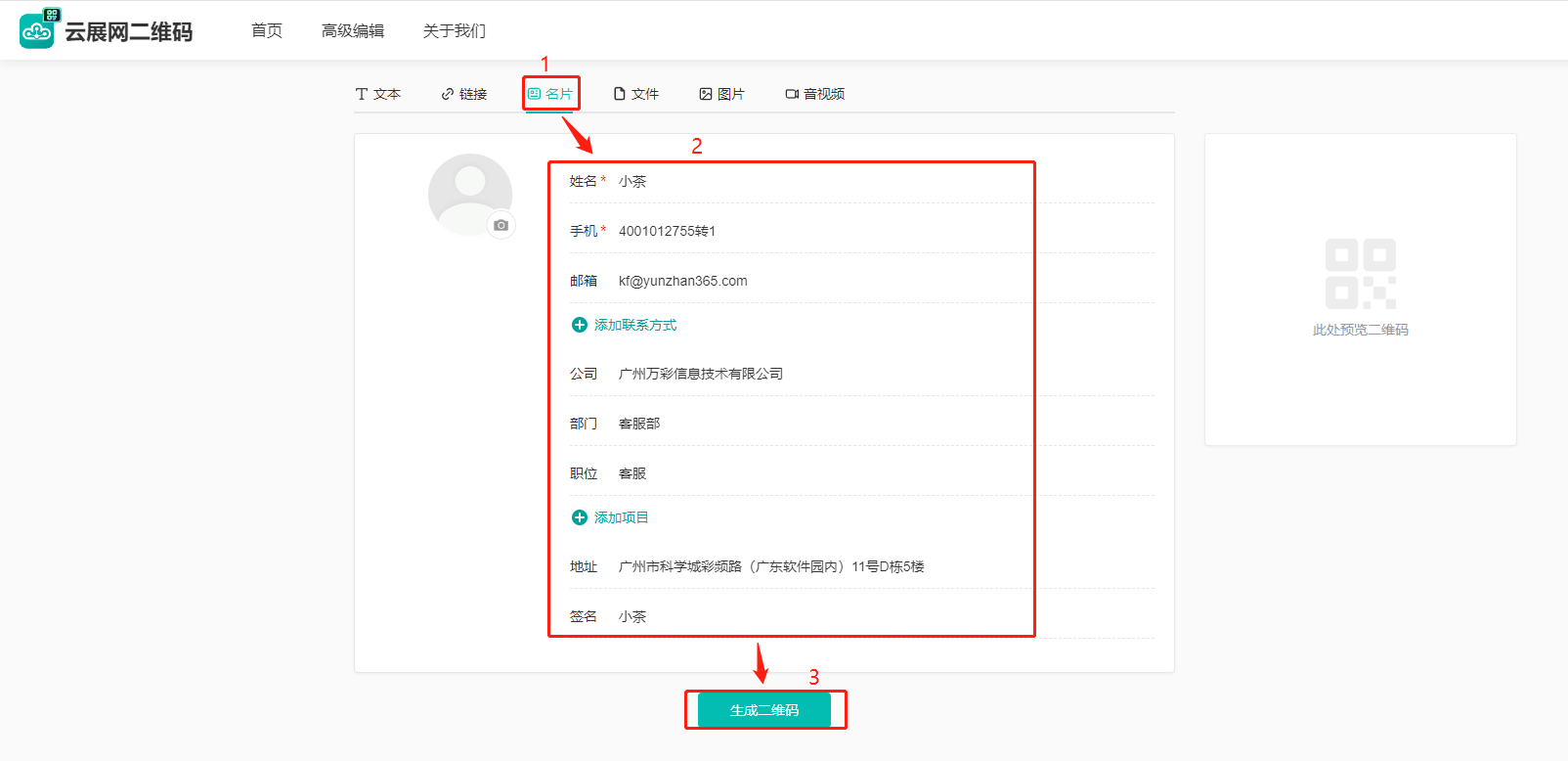 (1)點擊【名片】,下方輸入名片信息,點擊【生成二維碼】。